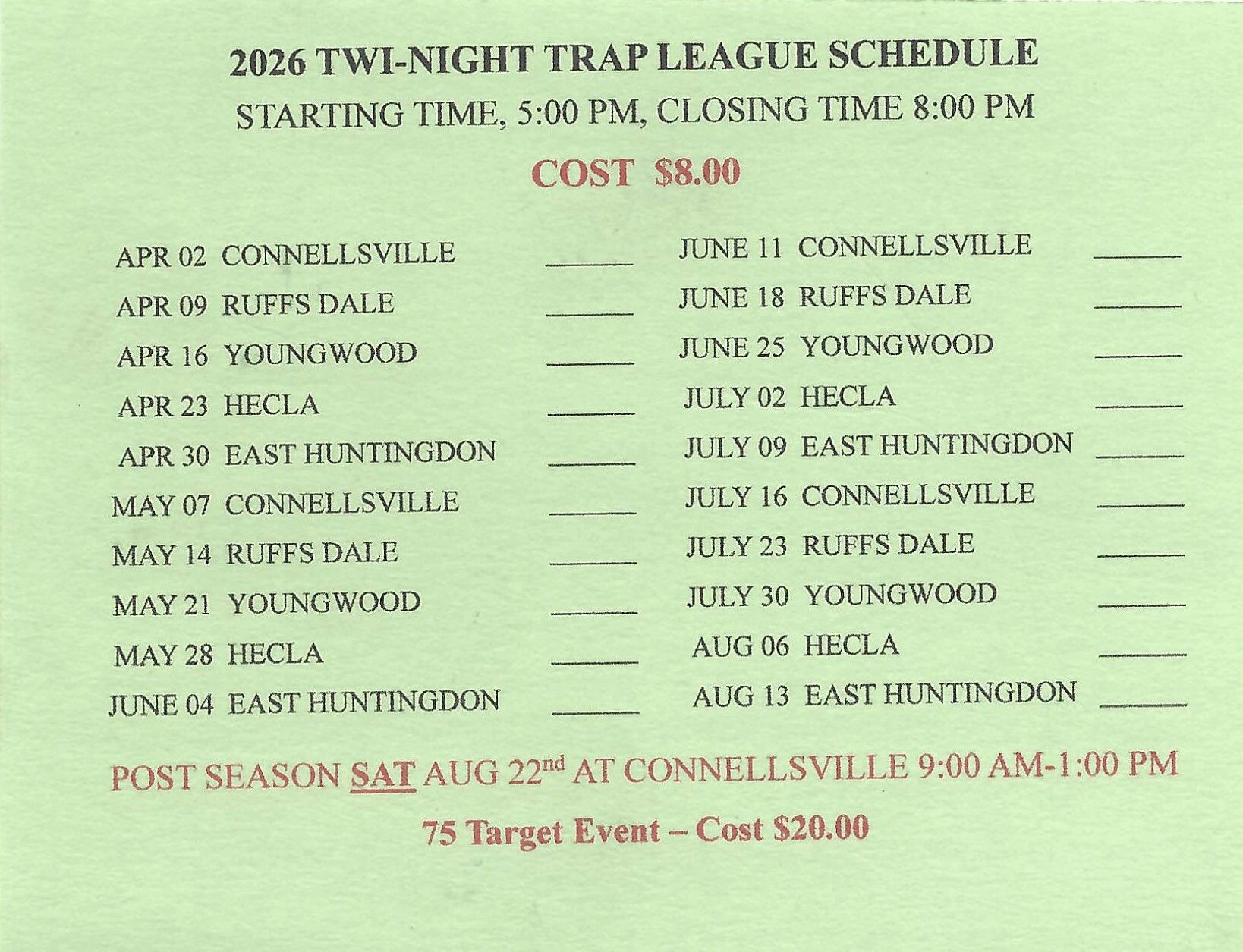 Southmoreland trap league will begin April 1, 2026 at 5:30 pm.